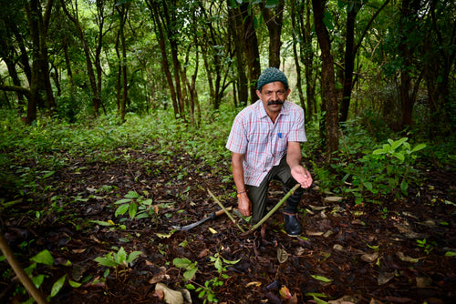 Farms in the village of Sirangalli range from one to eight acres; they are shade-grown farms, thriving in rich agroforestry ecosystems. The shade canopy is made up of native jungle trees and fruit-bearing trees. This multi-tiered structure supports biodiversity, enhances soil health, and contributes to the unique flavor profile of the coffees.