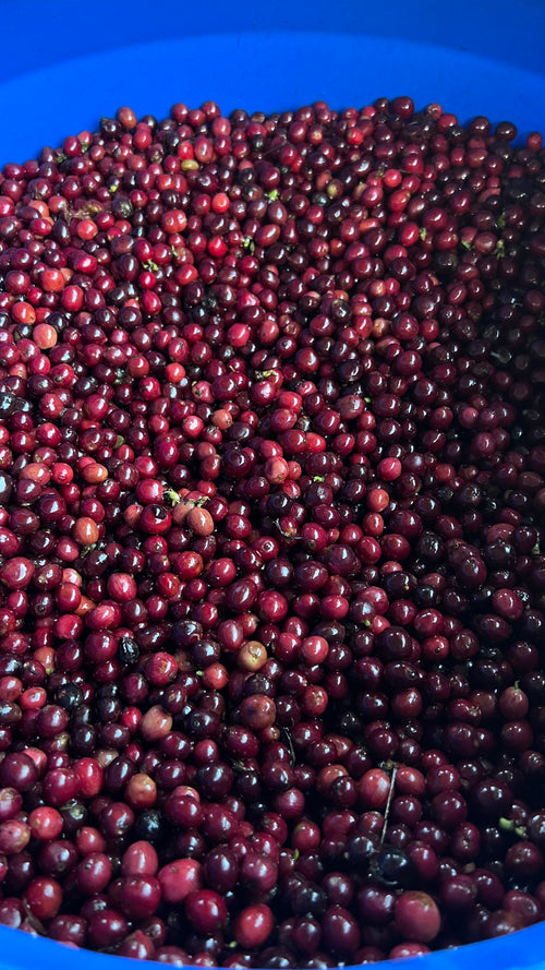 To create this lot, only the ripest cherries were carefully hand-picked to ensure optimal sugar content for clean and expressive fermentation. Right after harvest, the cherries were placed in a siphon to sort out any floaters. Next, the cherries were moved into sealed tanks where they were inoculated with a custom culture to create a controlled carbonic maceration environment. They were fermented for 60 hours. After fermentation, cherries were laid out on raised drying beds inside a polyhouse to protect them from rain and excessive heat. They were dried slowly over the course of 10-12 days, raked regularly to ensure even drying. Once the cherries reached a stable moisture level of 11-12% they were finally ready for safe storage and transport — this moisture level is ideal for preserving a clean cup profile without facilitating the growth of mold. The dried coffee was then packed in jute bags and stored for a minimum of two months before hulling. This resting period allows the internal moisture to equalize and flavour notes to stabilize.