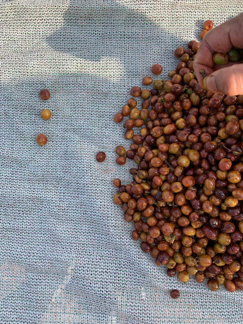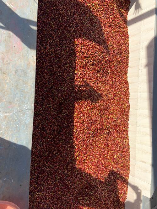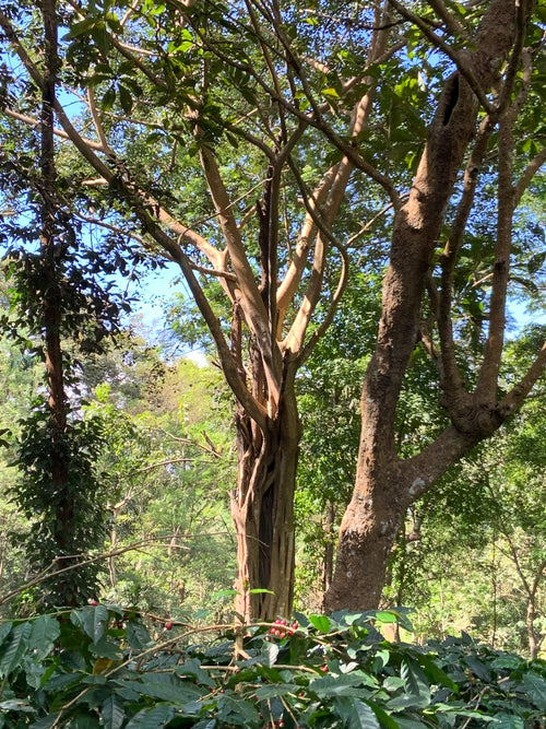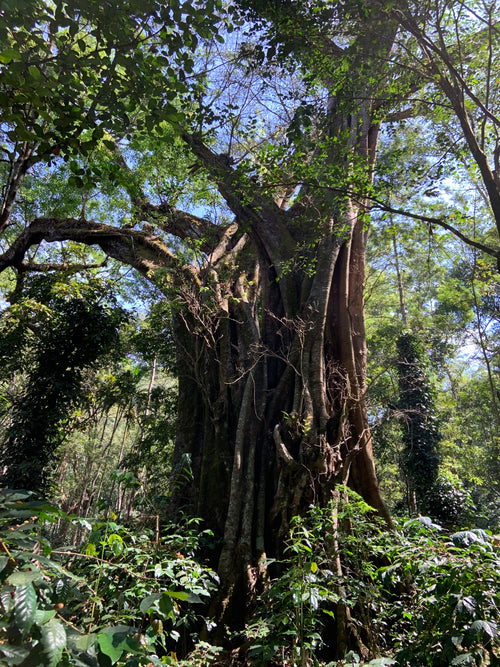 The estate is home to many beautiful cluster fig trees (some estimated to be 400 years old) that grow around other trees slowly and eventually engulf them. The cluster figs aren't particularly tasty to humans, but they are much beloved by the many birds that live there, and the birds' guano is an excellent fertiliser for the coffee. These fig trees are the secondary canopy, with the highest canopy coming primarily from citrus trees. The ample shade means the coffee can grow and mature slowly. As a result, the output on an estate like this is much, much lower than more intensive "monocrop" coffee farms, but if you take a wider look at the total sum of outputs from all the crops, they are incredibly productive. This coffee is a real investment in the environment.