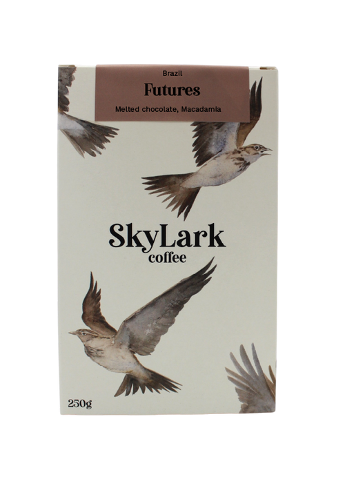 This is the most 'standard' tasting coffee on our menu, but perhaps the one we're most excited about. We've been looking to increase our Brazil buying impact for the 5 years since we started Skylark. Circumstances conspired to make this the perfect year for it. We love a lot of things about Brazil as a coffee origin: It has a strong minimum wage, a strong domestic consumption market to support producers, and we have more than a decade's worth of relationships and buying experience there. This Brazil 'Futures' is a new product line for Skylark that will keep a consistent flavor profile of Melted Chocolate and Macademia whilst sourcing from various smallholder farmers who can benefit from partnering with Skylark. You can read more about the mechanisms we're using below. It's a little nerdy, but very cool. We think you'll love it... It's the perfect 'coffee flavored coffee' with a big dose of impact.