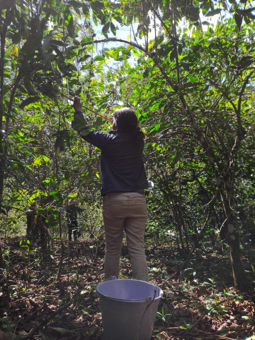Ensambles now has a regional lab in Montaña Alta with analysts and cuppers where producers can come and bring their sample. We provide feedback and recommendations until their coffee qualifies for the specialty premium. Our criteria range from cup quality, humidity/water activity, to yield. We are now able to employ and empower two women from the community to coordinate the lab and reach out to more producers across the region. "Nahual" means the ability to transform yourself into another being. We think it is a good analogy for the switch from commercial low paid coffee to quality better priced coffee.