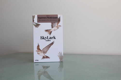 This is one of our most important coffees of the year. Mexican coffee has dwindled to almost nothing in recent years as a result of coffee leaf rust, low C market prices, political strife, and drug trafficking. Almost all remaining Mexican coffees are grown on large estates in Oaxaca and other well known provinces. This coffee is different. It is from the Guerrero region, and is grown by indigenous people in traditional biodynamic fashion. These coffees are from tiny farms (often less than a hectare) with productions of less than 60 kg from many of them. These farmers' way of life depends on companies like Skylark to support them by paying higher prices than the market would offer for the quality they supply... that's why we bought a really big lot from Guerrero this year. Fortunately, the quality of this particular lot is stellar. Notes of melted milk chocolate, coffee pulp, and Lambrusco will reward you for supporting these farmers like we did.